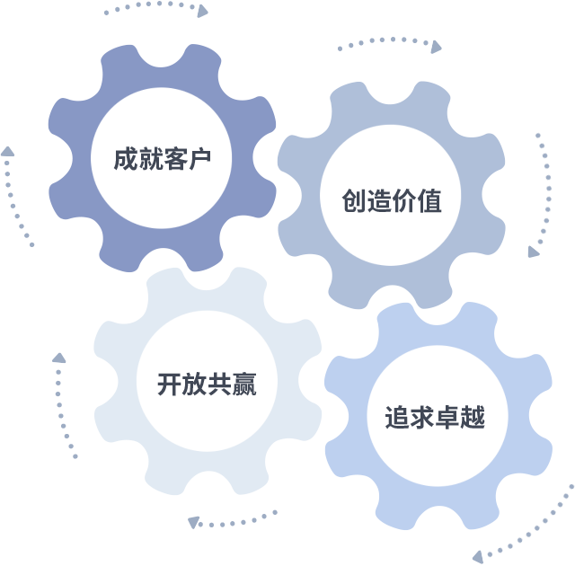 成就客户是一切决策的出发点,,,,创造价值是衡量所有工作的标准,,追求卓越是我们做事做人的态度,,开放共赢是我们的格局也是最终的结果。。。。价值观的齿轮环环相扣,,,,推动着组织里的每个人不断向前。。。
